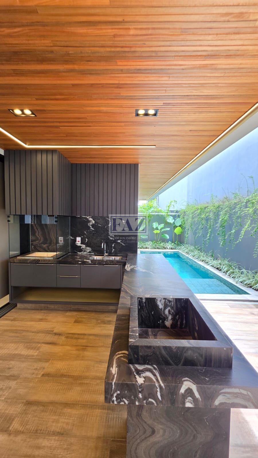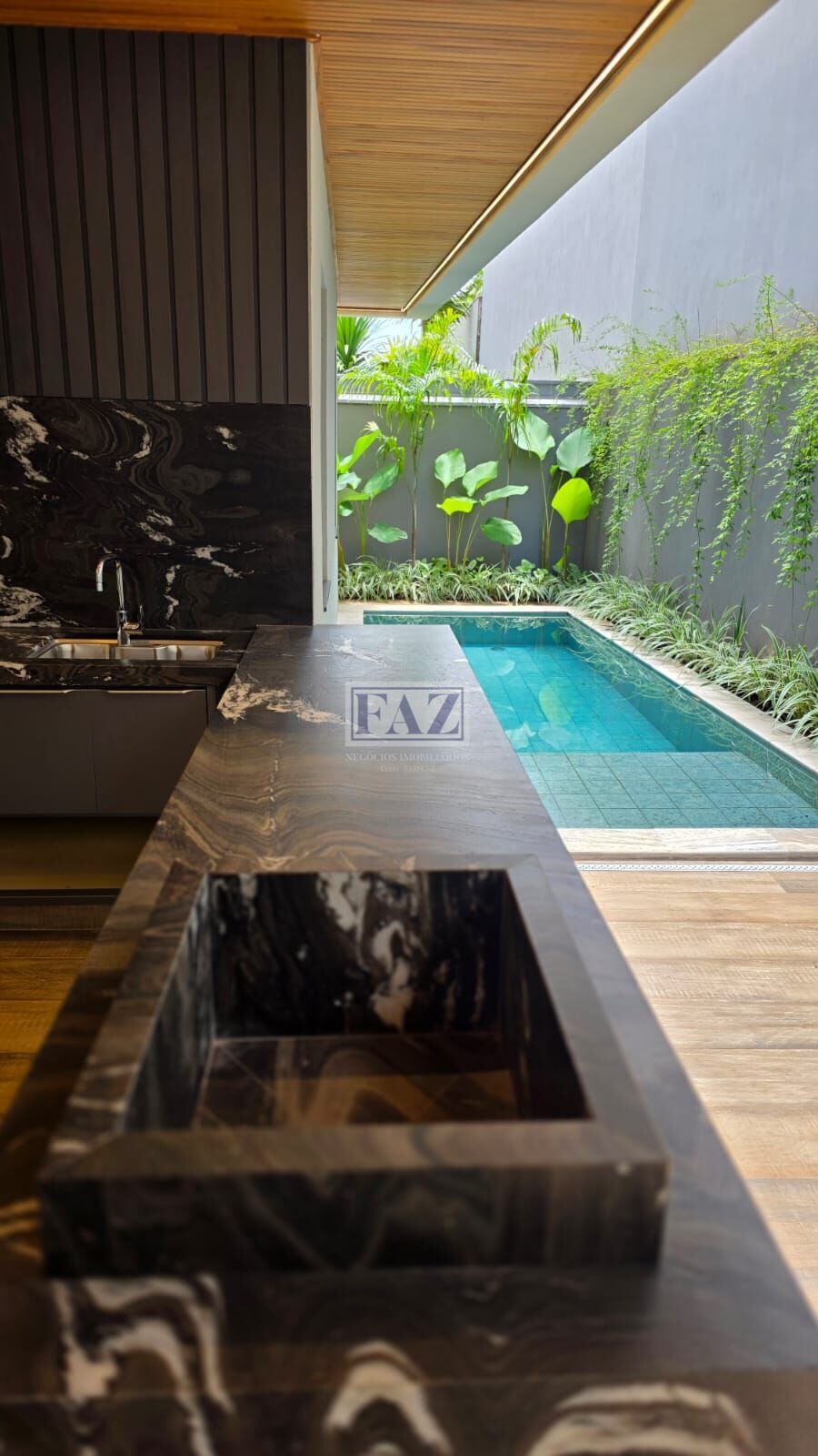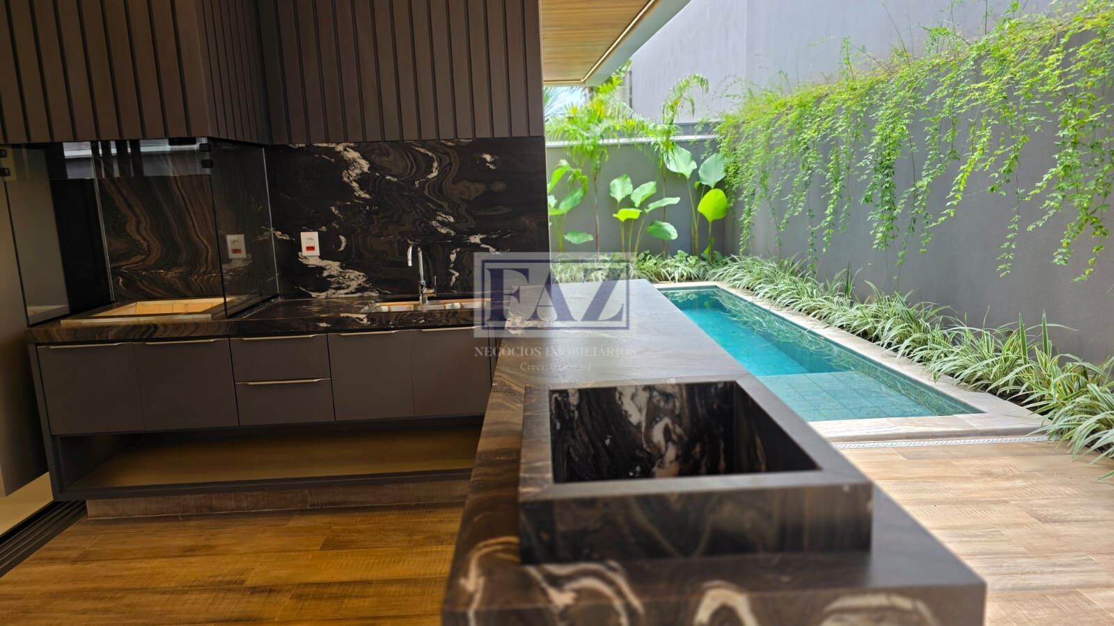 Na área de lazer, destaque para o espaço gourmet com península e churrasqueira a braseiro, perfeito para receber convidados. O imóvel ainda dispõe de vestiário, armário externo e uma belíssima piscina com 4 bicos de hidromassagem, preparada para aquecimento, iluminação e sistema fotovoltaico.